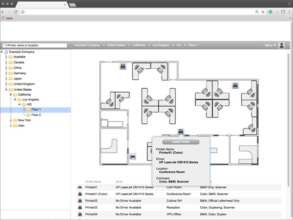 Mit unserer Drucker- und Treibermanagementlösung für Unternehmen werden Druckserver überflüssig. Die Lösung umfasst zentralisierte Druckmanagementfunktionen und ermöglicht Endanwendern die Installation ihrer eigenen Drucker mit nur einem Klick. Zudem vereinfacht die Plattform Ihr Druckmanagement durch folgende Vorteile: